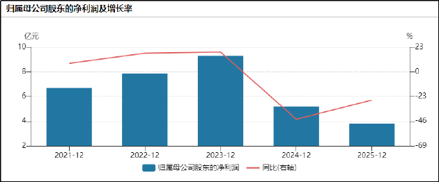 从财务数据看,就营收端而言,公司营收增速从2022年的28.54%降至2023年的11.21%,再到2024年的-0.36%、2025年的-0.54%,正式迈入负增长区间。利润端,归母净利润从2023年18.35%的正增长,转为2024年的-44.13%、2025年的-26.44%,盈利规模连续大幅下滑。